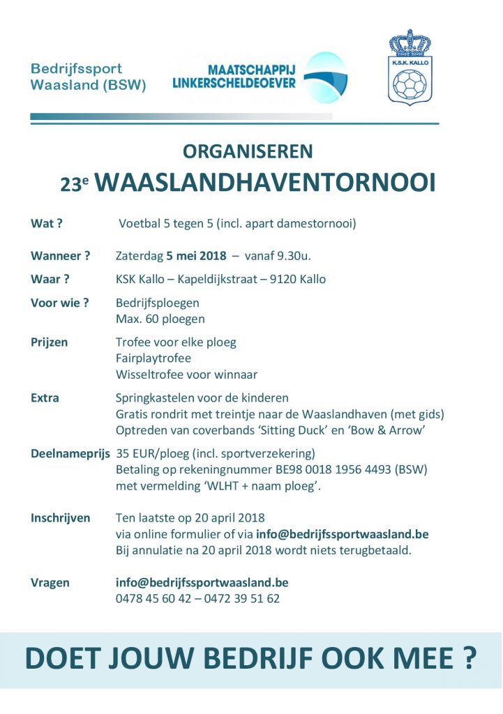 Op zaterdag 5 mei 2018 organiseert BSW, samen met Maatschappij Linkerscheldeoever en KSK Kallo het 23e Waaslandhaventornooi.
