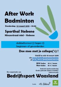 Nu de succes-editie van vorig jaar organiseren we opnieuw een After Work Badminton, nl. op donderdag 22 maart 2018 in Stekene.