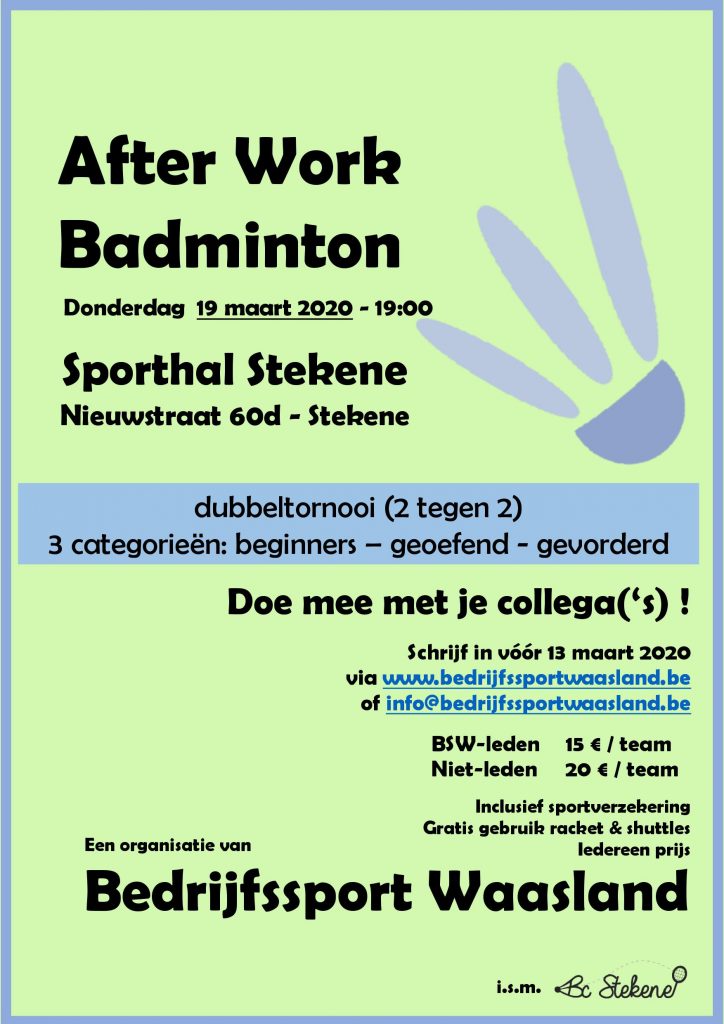 Deze After Work Badminton is een leuk en gezellig dubbeltornooi, zowel voor beginners, recreatieve als gevorderde spelers. Motiveer je collega(‘s) en wacht niet te lang om in te schrijven (max. 50 ploegen) !